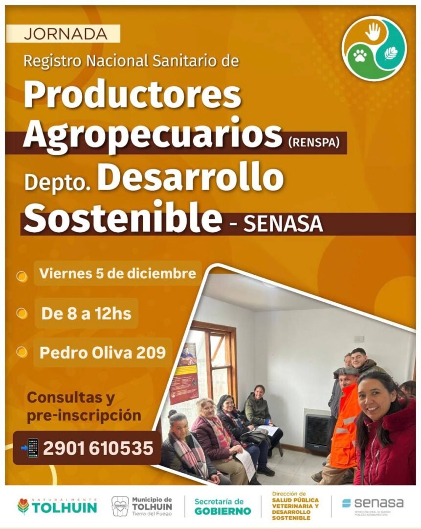 Este viernes 5 de diciembre, de 8 a 12 horas, se llevará adelante una nueva jornada de atención del Registro Nacional Sanitario de Productores Agropecuarios (RENSPA) en la ciudad de Tolhuin. La actividad será desarrollada por el Departamento de Desarrollo Sostenible del Municipio, en coordinación con SENASA Río Grande, organismos responsables de acompañar a los productores locales en la tramitación y actualización de este registro obligatorio.